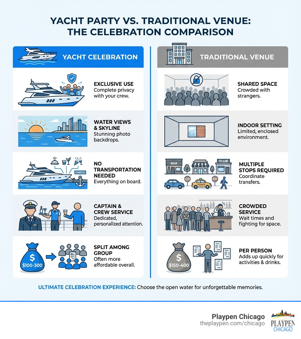 Plus, yacht parties can be surprisingly budget-friendly. Splitting costs among 8-10 guests for a charter often costs less per person than a traditional bar-hopping weekend with its expensive venues, bottle service, and transport between locations.