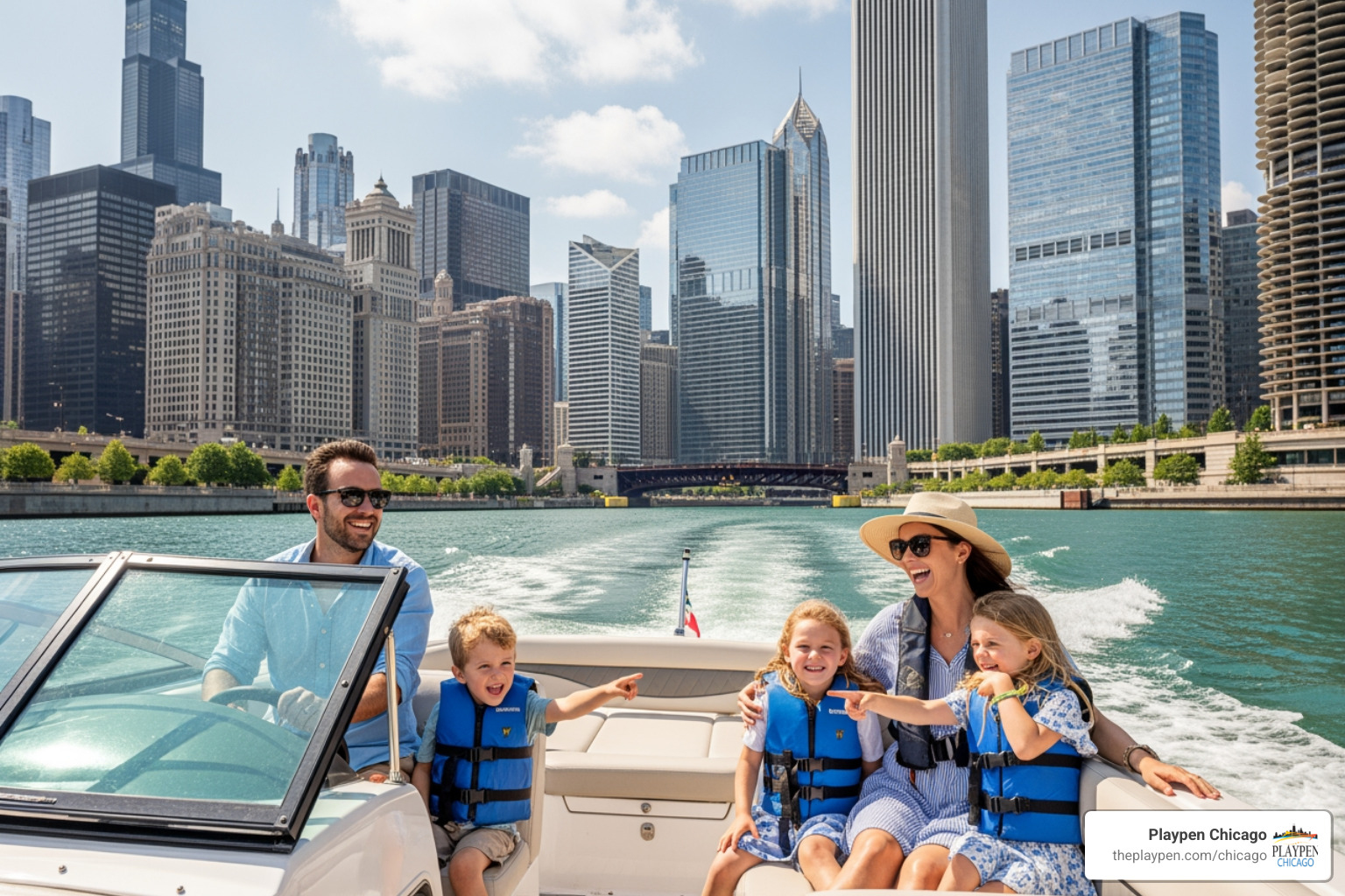 family enjoying modern powerboat on Chicago River - chicago boat club
