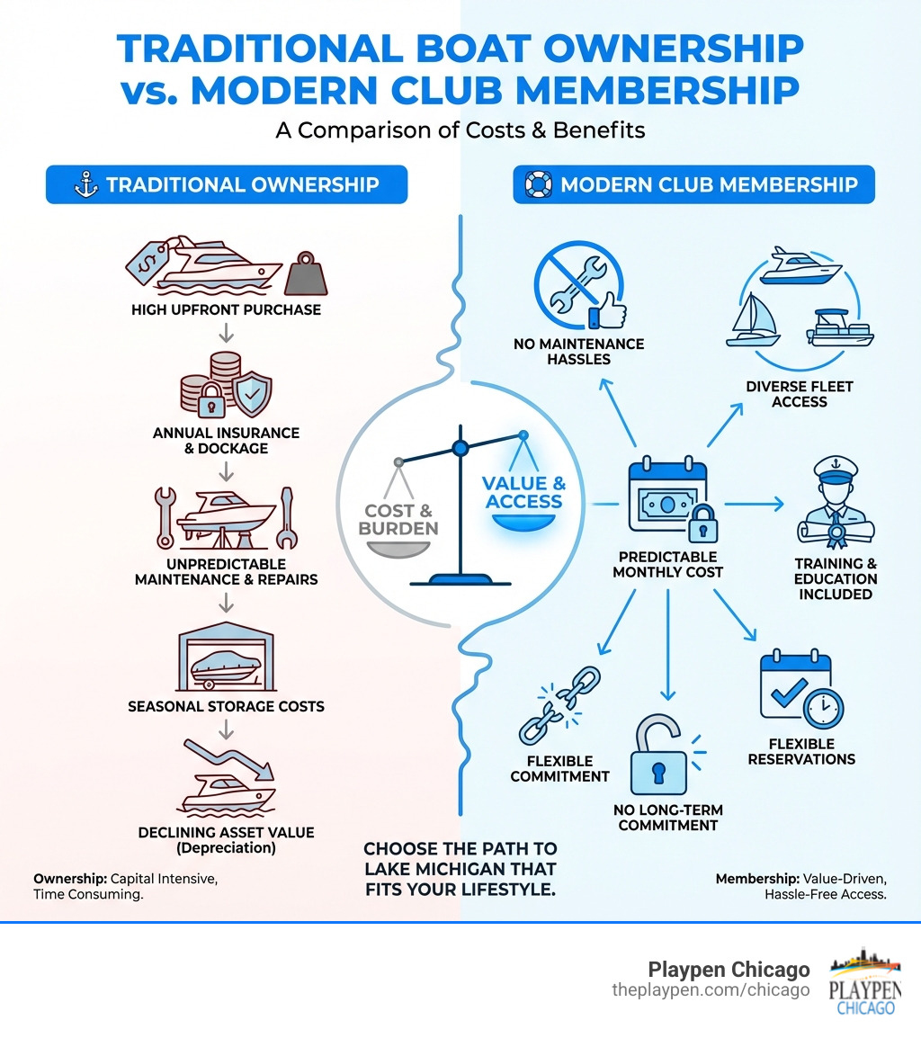 Infographic comparing traditional boat ownership costs (purchase price, insurance, docking fees, maintenance, storage, depreciation) versus modern boat club membership benefits (fixed monthly cost, no maintenance, fleet variety, training included, flexible reservations, no long-term commitment) - chicago boat club infographic
