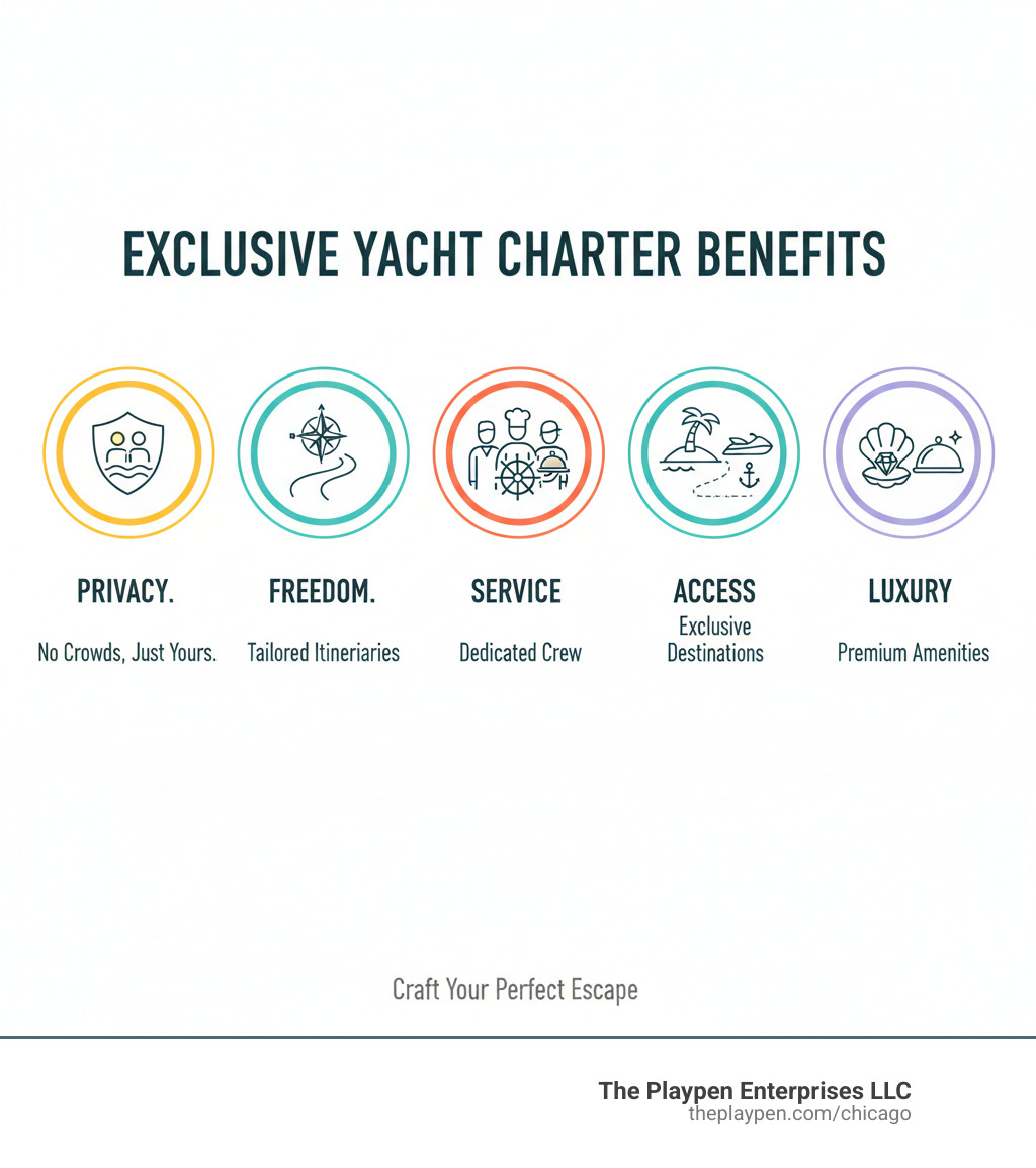 Infographic showing the key benefits of private yacht charters: Privacy with no crowded spaces or shared amenities; Freedom with custom itineraries and flexible schedules; Service with dedicated crew including captain, chef, and stewards; Access to exclusive destinations unreachable by larger vessels; and Luxury with spa facilities, water toys, gourmet dining, and premium amenities - Exclusive yacht experiences infographic