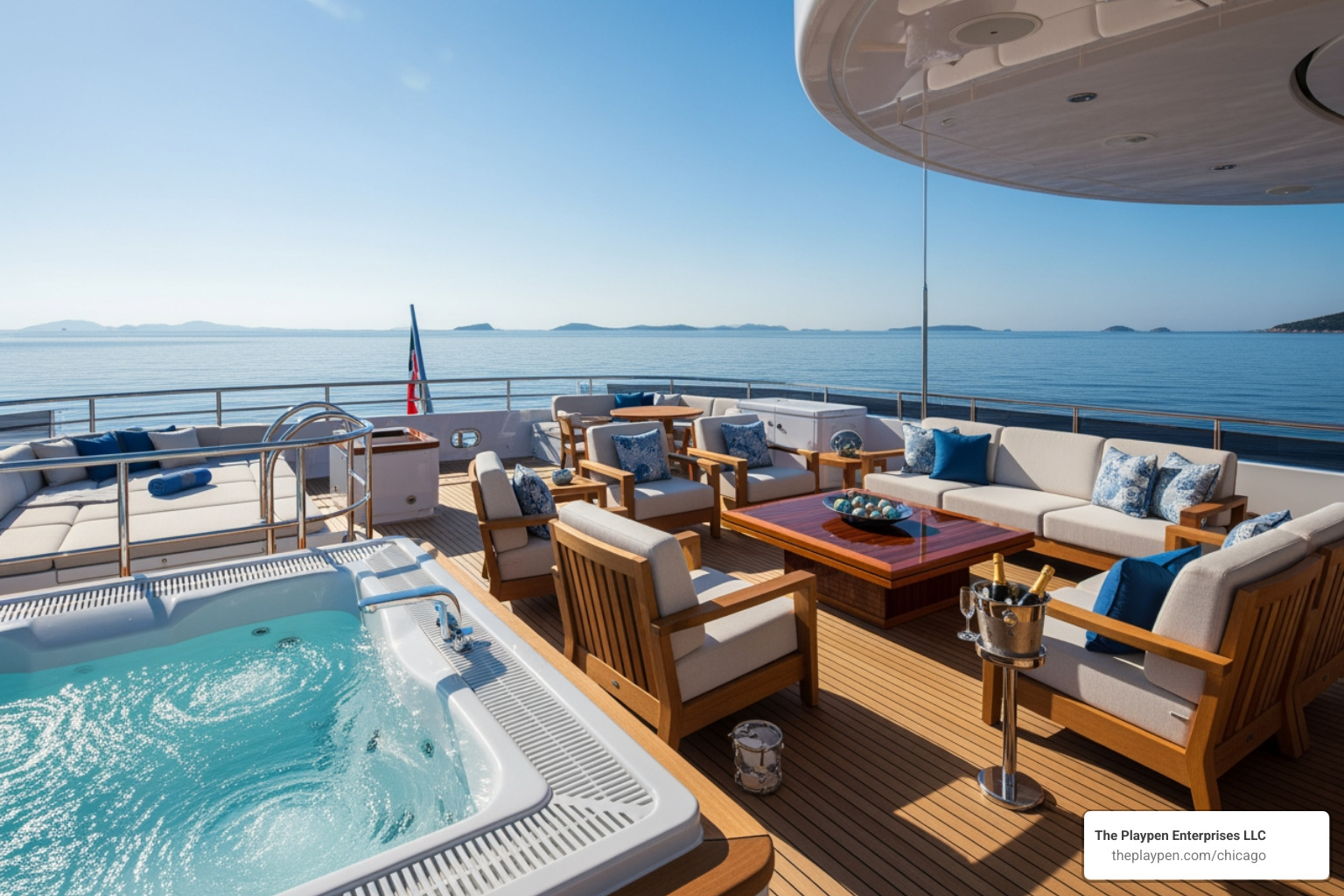 A superyacht's deck with a jacuzzi and lounge area - Exclusive yacht experiences