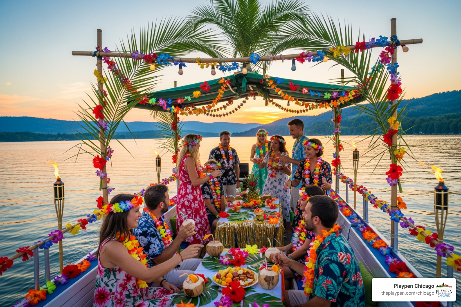 - Tropical Luau: Turn your boat into a Hawaiian-inspired escape with palm leaves, vibrant flowers, and bamboo accents. Guests can don Hawaiian shirts and flower leis.