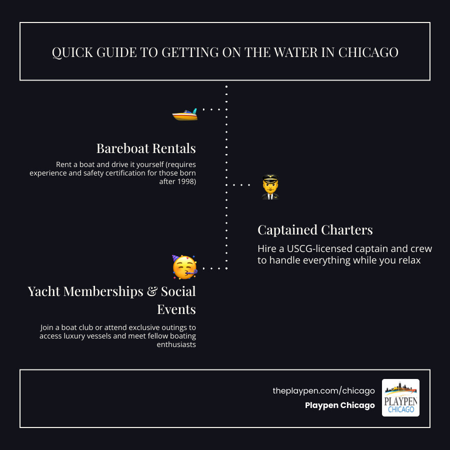 Booking your ideal boat rental or charter in Chicago is designed to be straightforward and convenient. Most operators use online booking platforms, allowing you to browse available vessels, check schedules, and secure your date with ease. On our platform, Playpen Chicago, you can connect directly with hosts, boat owners, and charter operators, making the process seamless.