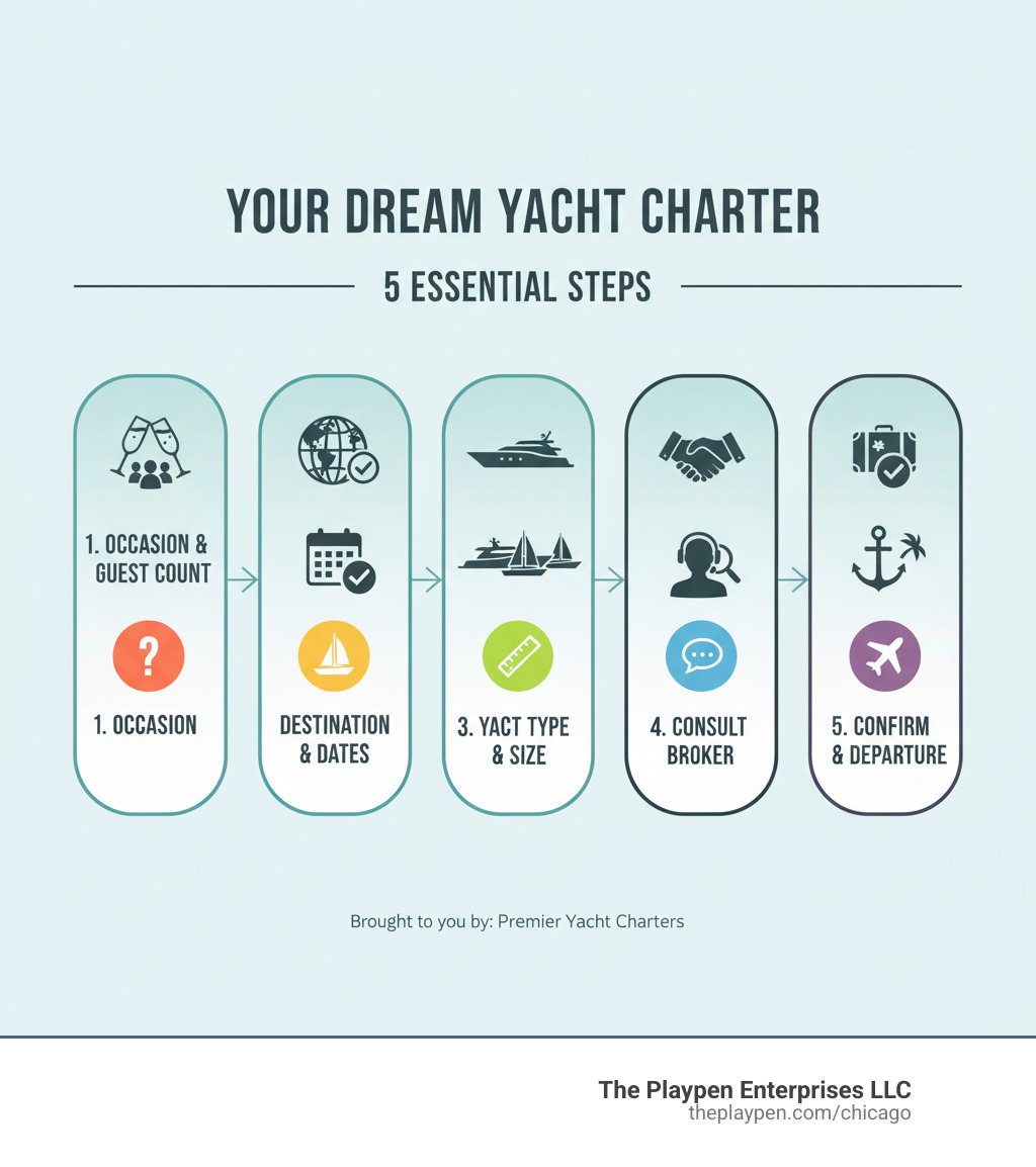 Infographic showing the 5 essential steps to booking your dream yacht charter: 1. Define your occasion and guest count, 2. Choose your destination and cruising dates, 3. Select your yacht type and size, 4. Consult with a charter broker to finalize details, 5. Confirm booking and prepare for departure - Premier yacht charters infographic
