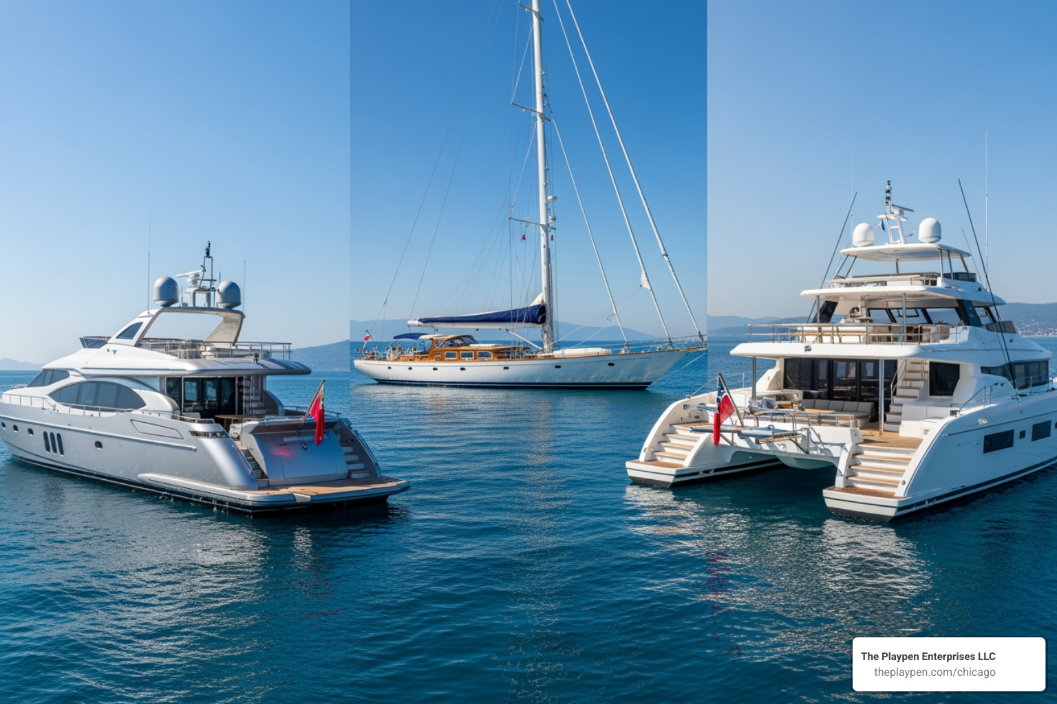A sleek motor yacht, a classic sailing yacht, and a spacious catamaran side-by-side on the water - Premier yacht charters