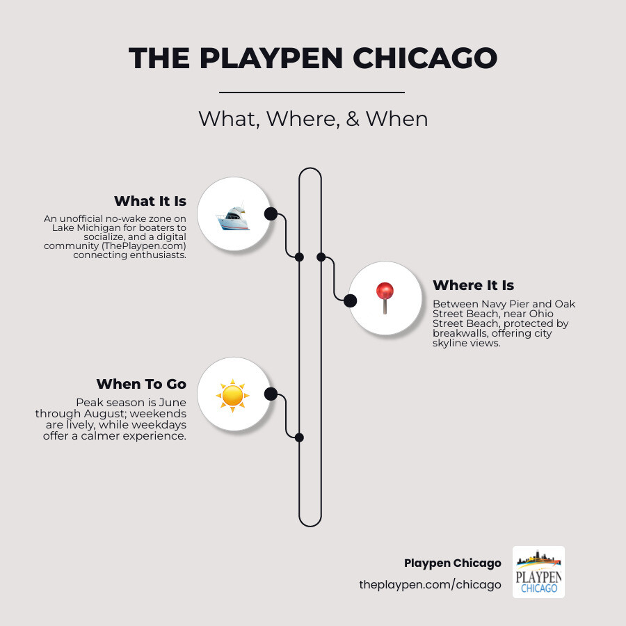 What is Playpen Chicago? It’s both a physical location and a digital community. The Playpen is an unofficial no-wake zone on Lake Michigan, located between Oak Street Beach and Navy Pier, where boaters gather to socialize, party, and enjoy the summer. It’s also ThePlaypen.com—a social networking platform and mobile app that connects boat owners, charter operators, and enthusiasts, helping people find invitations to private yacht parties and exclusive events.