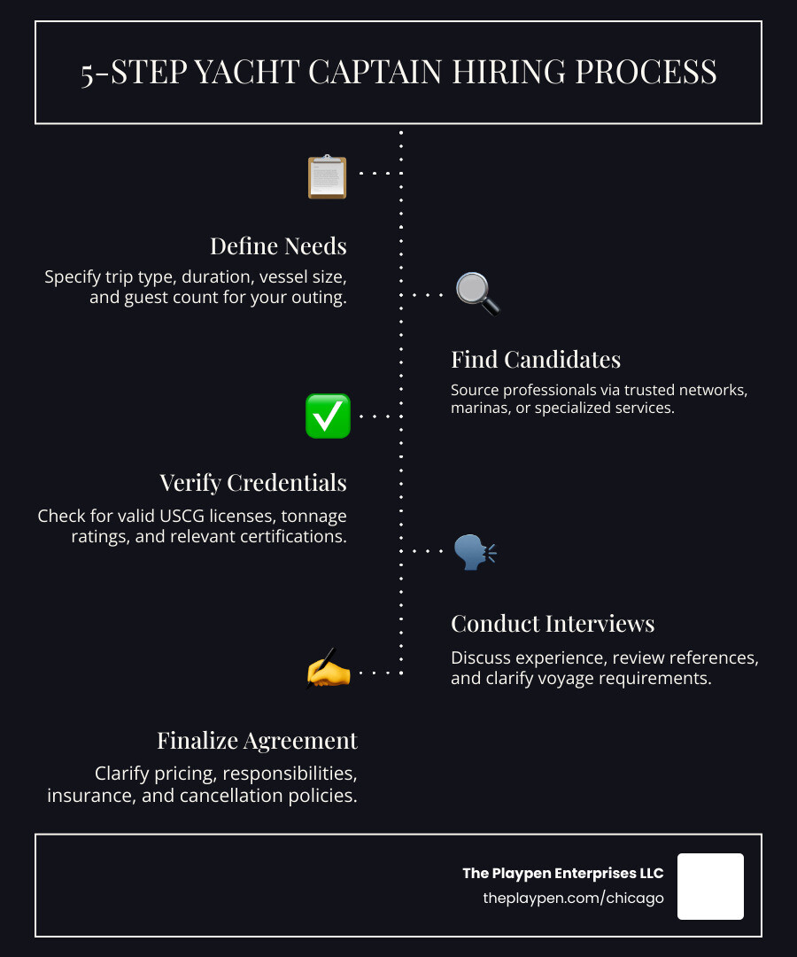 Infographic showing the 5-step yacht captain hiring process: Step 1 - Define voyage requirements including trip type, duration, and budget; Step 2 - Source candidates through trusted networks, marinas, and specialized services; Step 3 - Verify qualifications including USCG licenses and certifications; Step 4 - Conduct thorough interviews and check references; Step 5 - Finalize agreement with clear terms on pricing, responsibilities, and policies - Yacht captain for hire infographic infographic-line-5-steps-dark